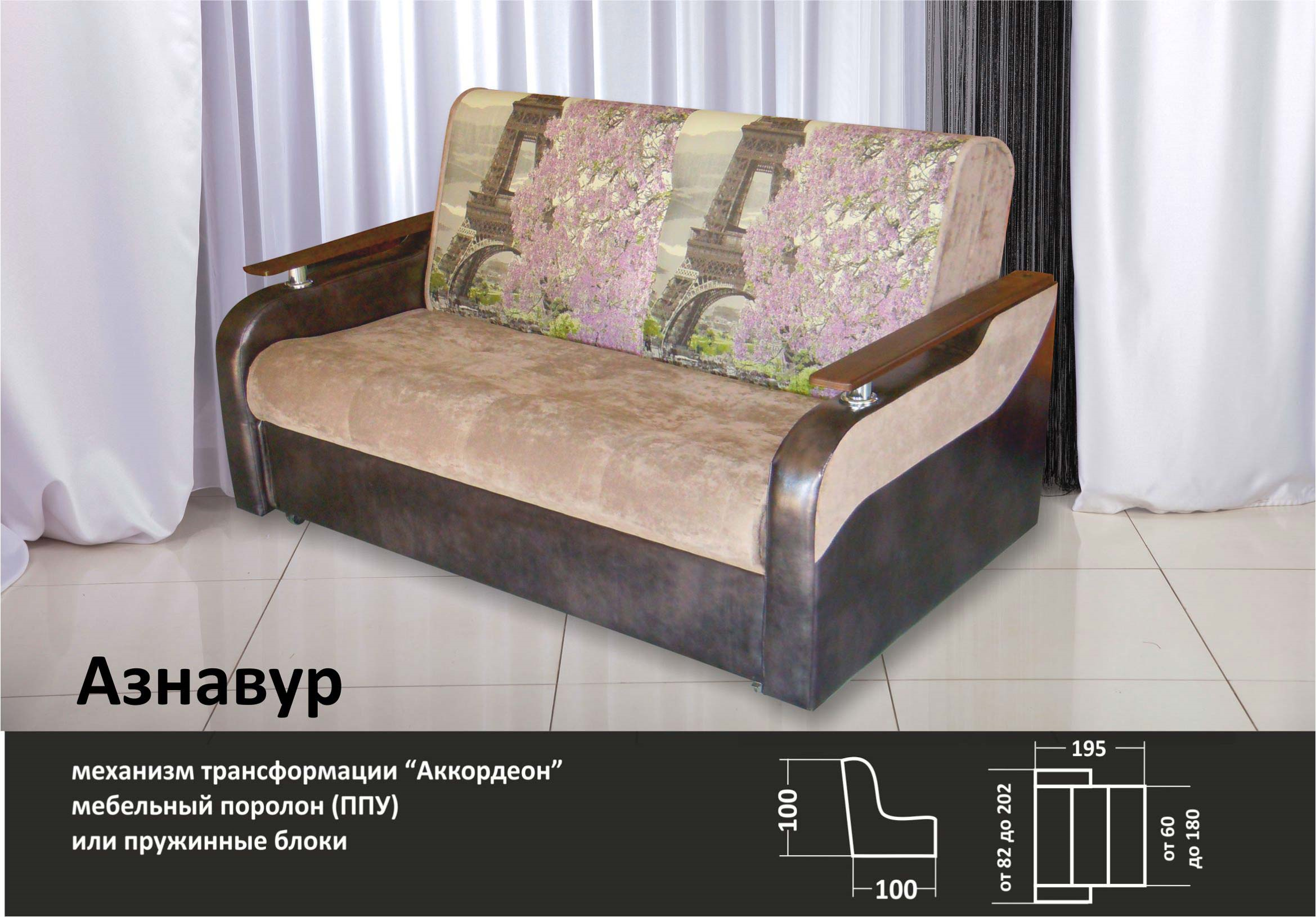 Спальное место: ширина дивана от 90 (см) до 180 (см), кресла-кровати от 60 (см) до 80 (см); длина 195 (см).