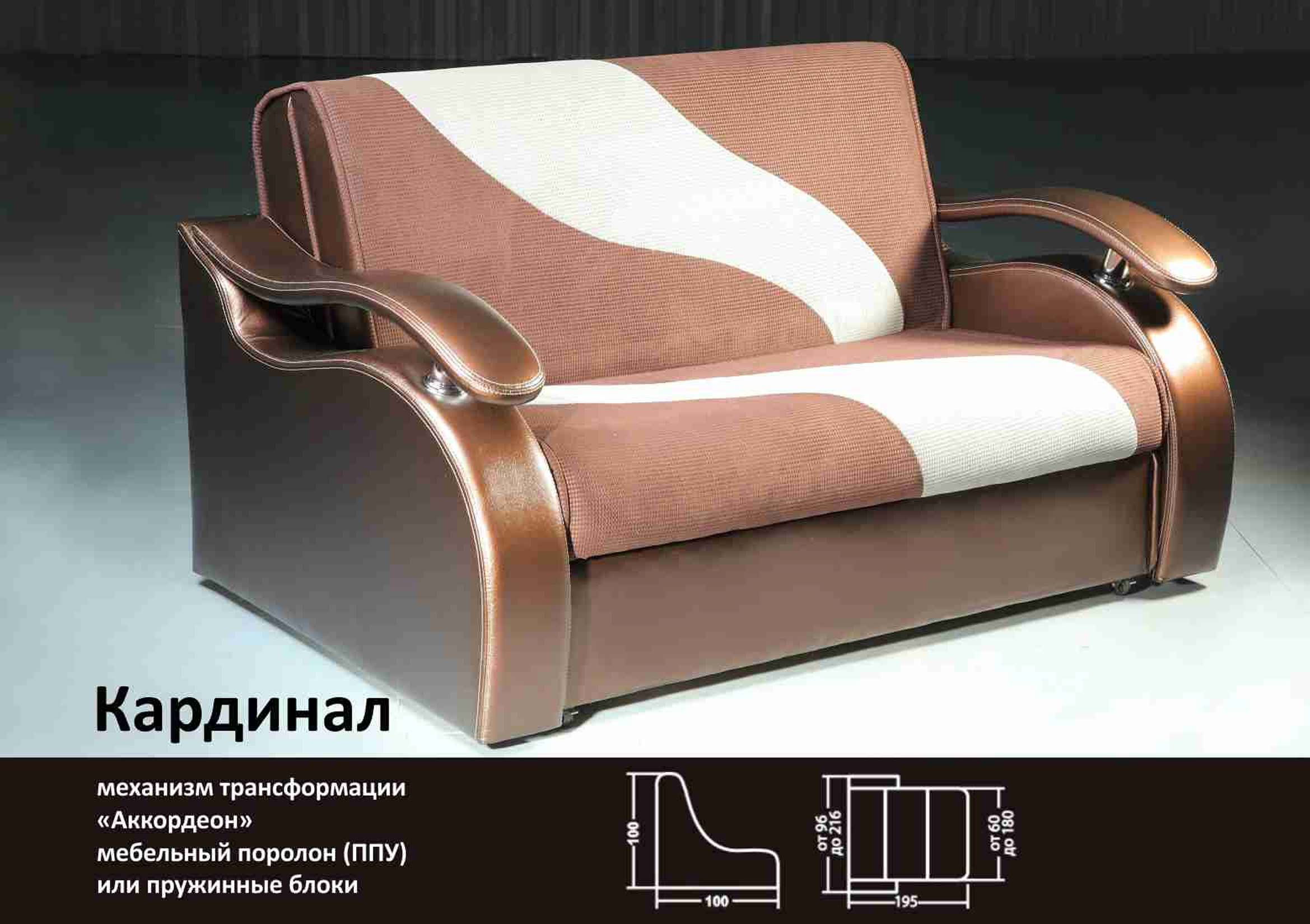 Стандартный вариант: диван-аккордеон 120 (см) спальное место, кресло-кровать аккордеон 60 (см); Наполнение -ППУ.