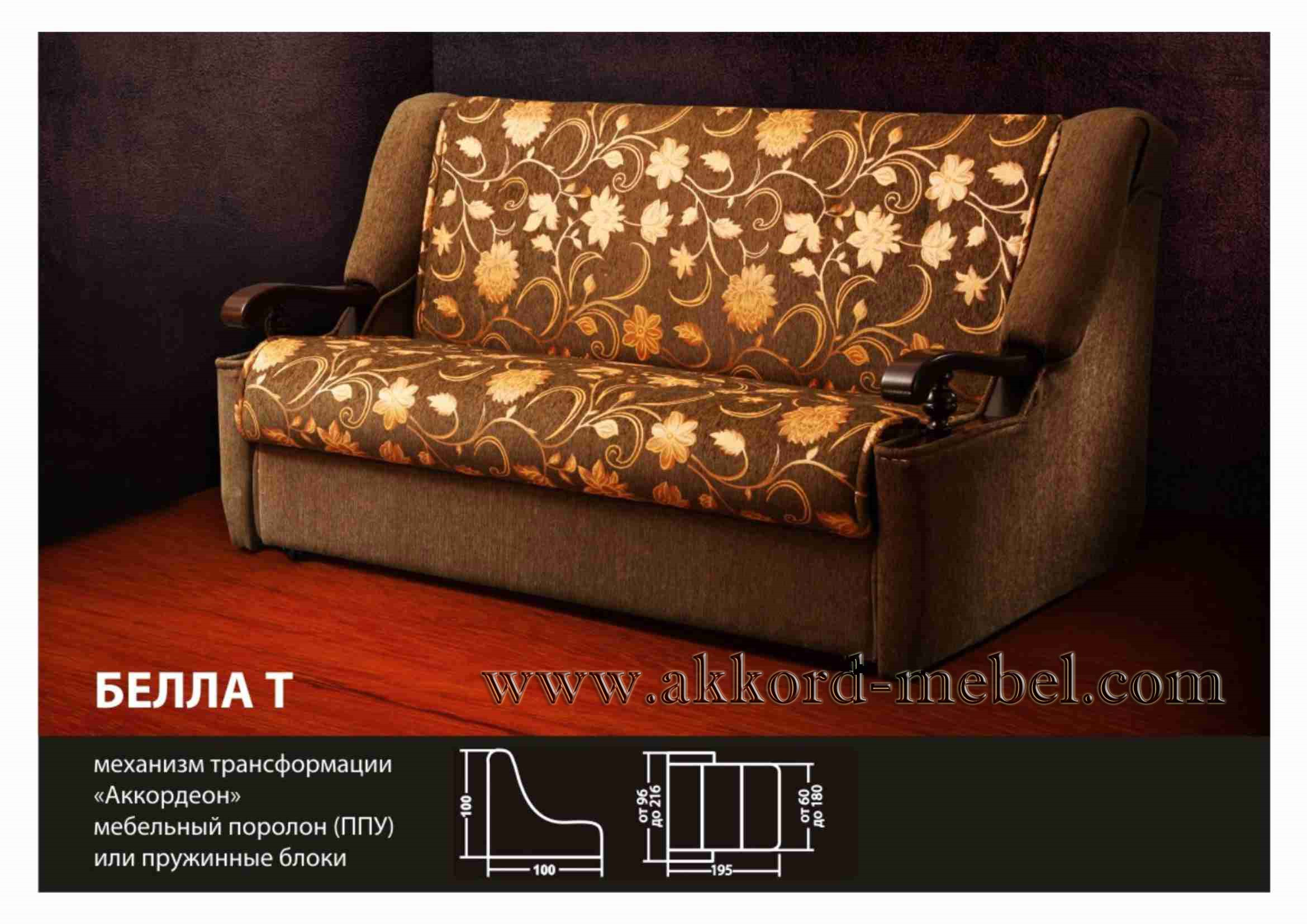 Стандартный вариант: диван-аккордеон 120 (см) спальное место, кресло-кровать аккордеон 60 (см); Наполнение -ППУ.