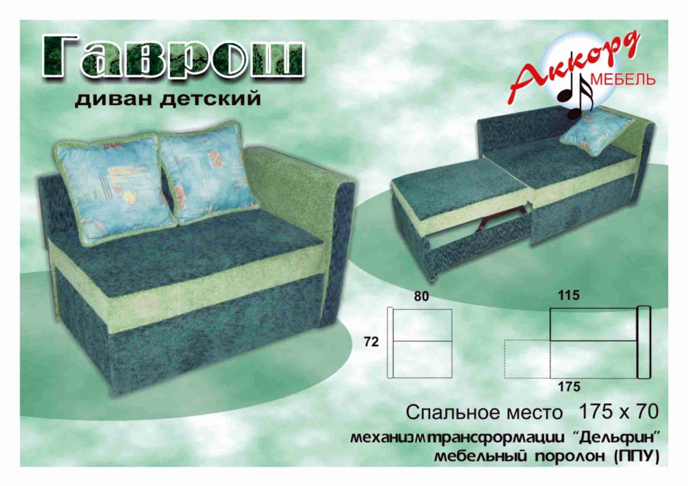 Малогабаритные детские диваны. Выполнены в форме кушетки. В сложенном виде очень компактные диванчики, не занимают много места, раскладываются вдоль стены вправо или влево с помощью механизма трансформации "Дельфин". Диван Гаврош-2 оснащён небольшим выдвижным ящичком.