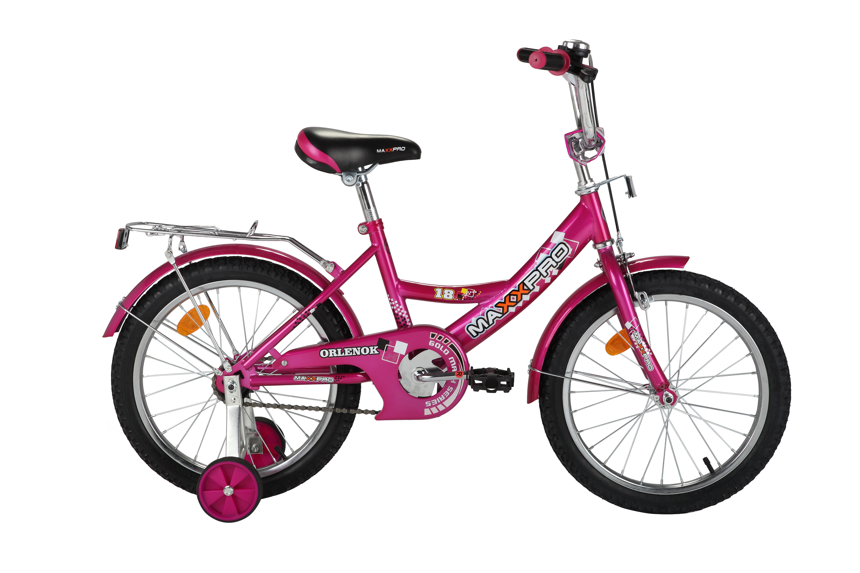 Цвет:розовый.18" размер колеса,стальная рама,задний ножной тормоз,передний ободной тормоз,никелированный обод,крашенные крылья.Багажник,звонок. Стальная защита цепи,боковые колеса.