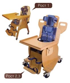 Опора-стул изготовлена из высококачественных пород дерева. Имеет специальные регулируемые крепления, способствующие созданию «правильного положения» тела. За счет изменения углов наклона спинки опоры-стула и подставки для ног (максимум на 45 градусов), возможно изменение положения тела, не покидая опору-стул. Съемная, регулируемая по высоте столешница, предназначена для развития у ребенка моторных навыков и ухода за ним. Опора-стул оборудован специальными колесами с фиксацией, для легкого перемещения. Опора -стул размер 2 и 3 оборудован платформой для устойчивости конструкции.