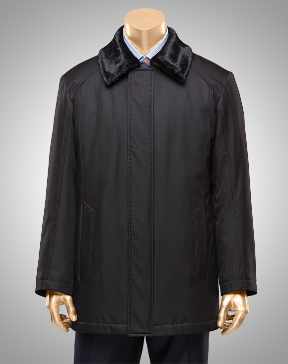 Силуэт прямой. Застежка центральная на пластиковую «молнию» и потайные кнопки планки. Воротник - стояче-отложной с частично отрезной стойкой. Боковые карманы с декоративными подрезами в рельефных швах полочек. Спинка с имитацией боковых шлиц. Стежка подкладки цветными нитками. 2 внутренних кармана с красной листочкой и «молнией».