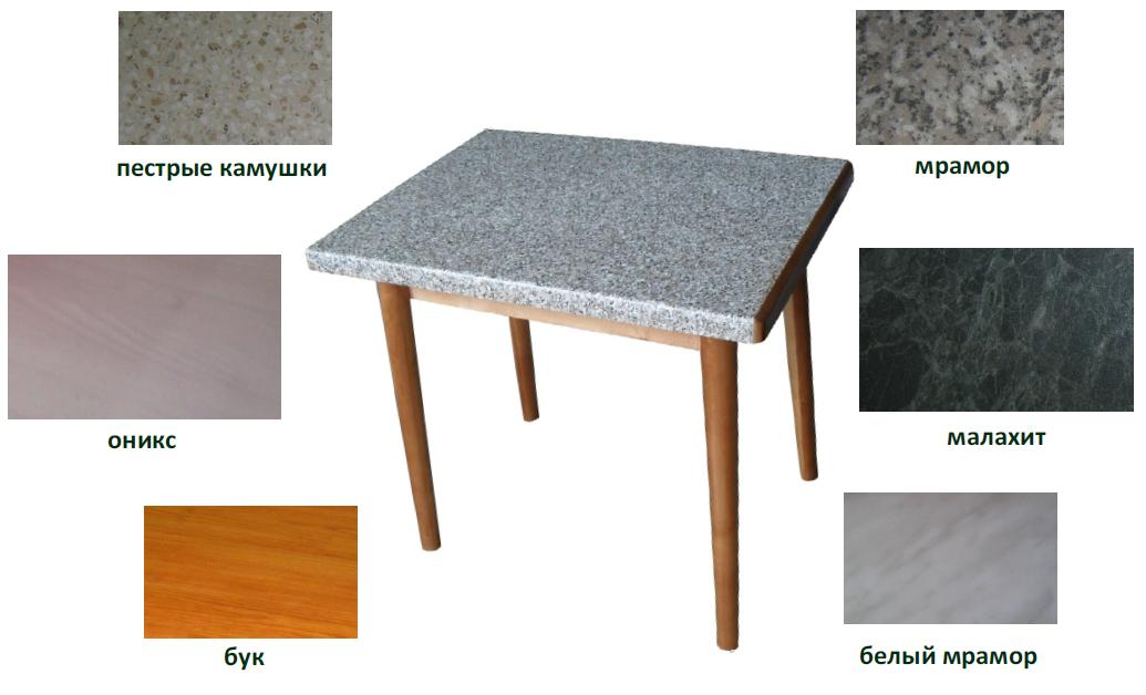 Цвета столешницы: пёстрые камешки, гранит, малахит, мрамор, ольха, бук, оникс, вишня.